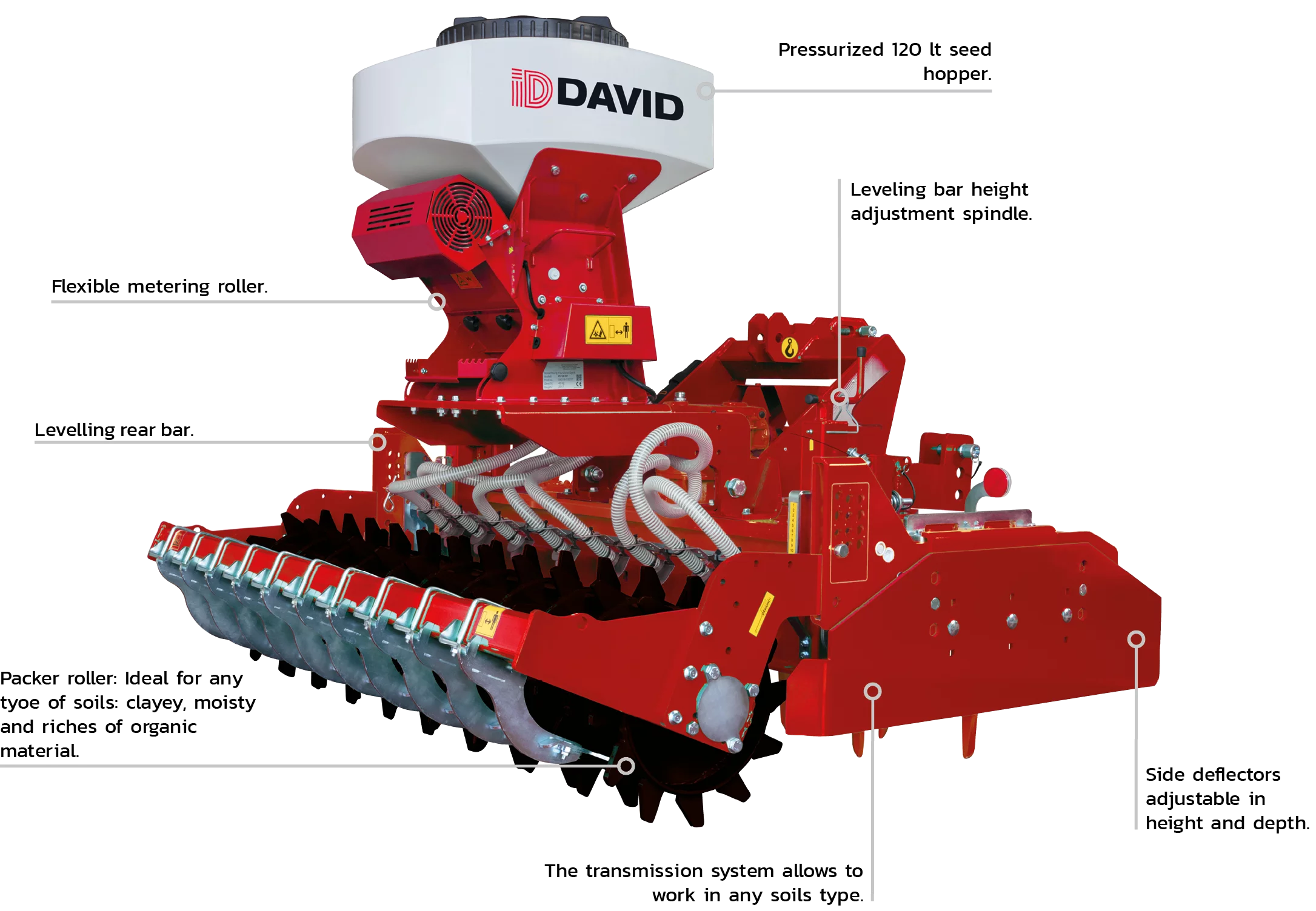 Pnömatik ekim makinesi ile donatılmış döner tırmık. Organik madde ve besinlerin hazırlanması, oksijenasyonu, ayıklanması ve derinlemesine karıştırılması için idealdir. Örtü bitkileri oluşturmak için ideal olan 8 çıkışa ve kabinde elektrik kontrolüne sahip pnömatik bir ekim makinesi ile donatılmıştır.