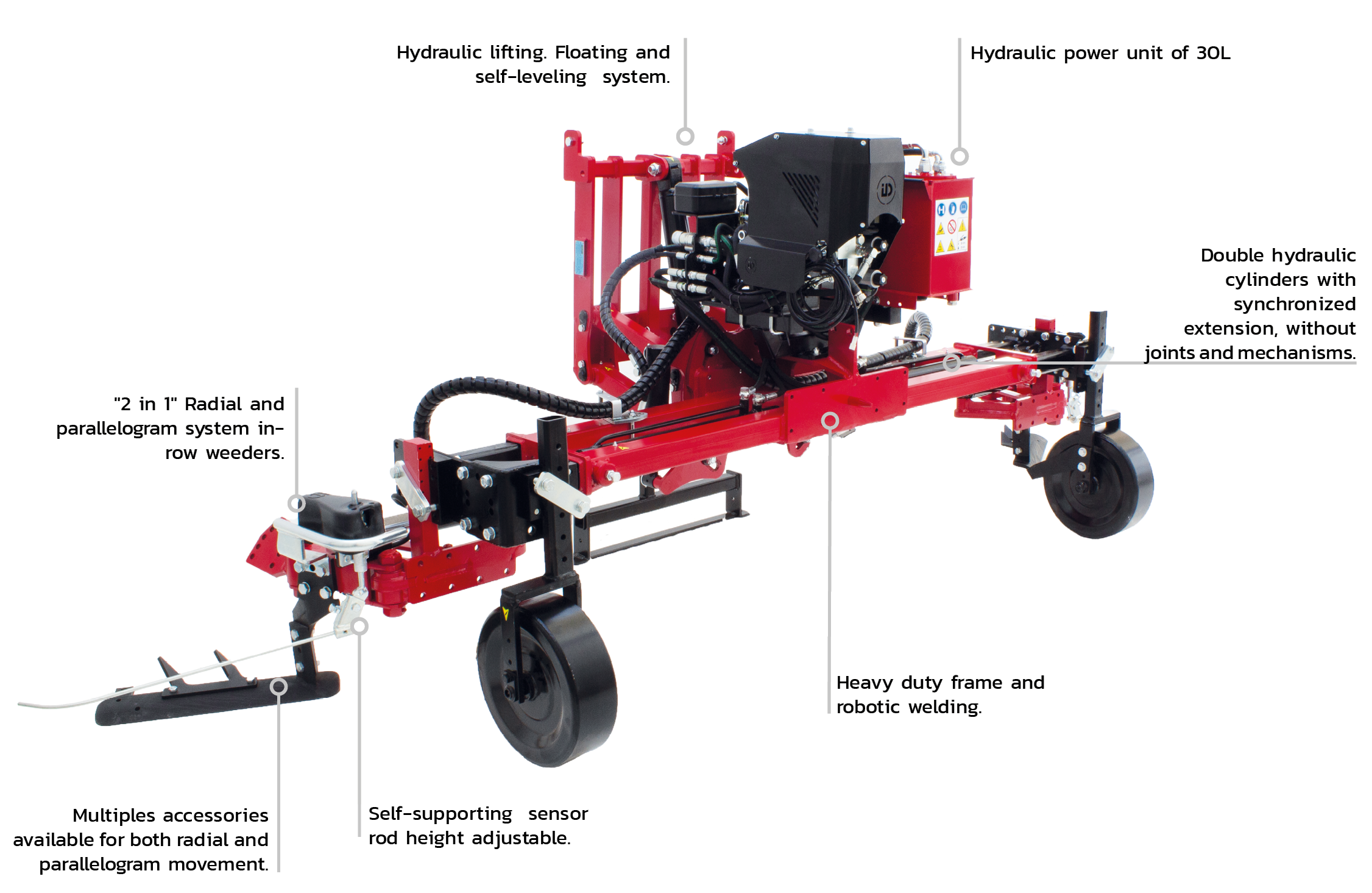 Ön 3. kuyruk mili bağlantısı olmayan herhangi bir traktöre takılabilen, toprak sürme ve bitki içinde ot ayıklama için tasarlanmış öne monte edilebilen ve genişletilebilen sıra üzeri şasi