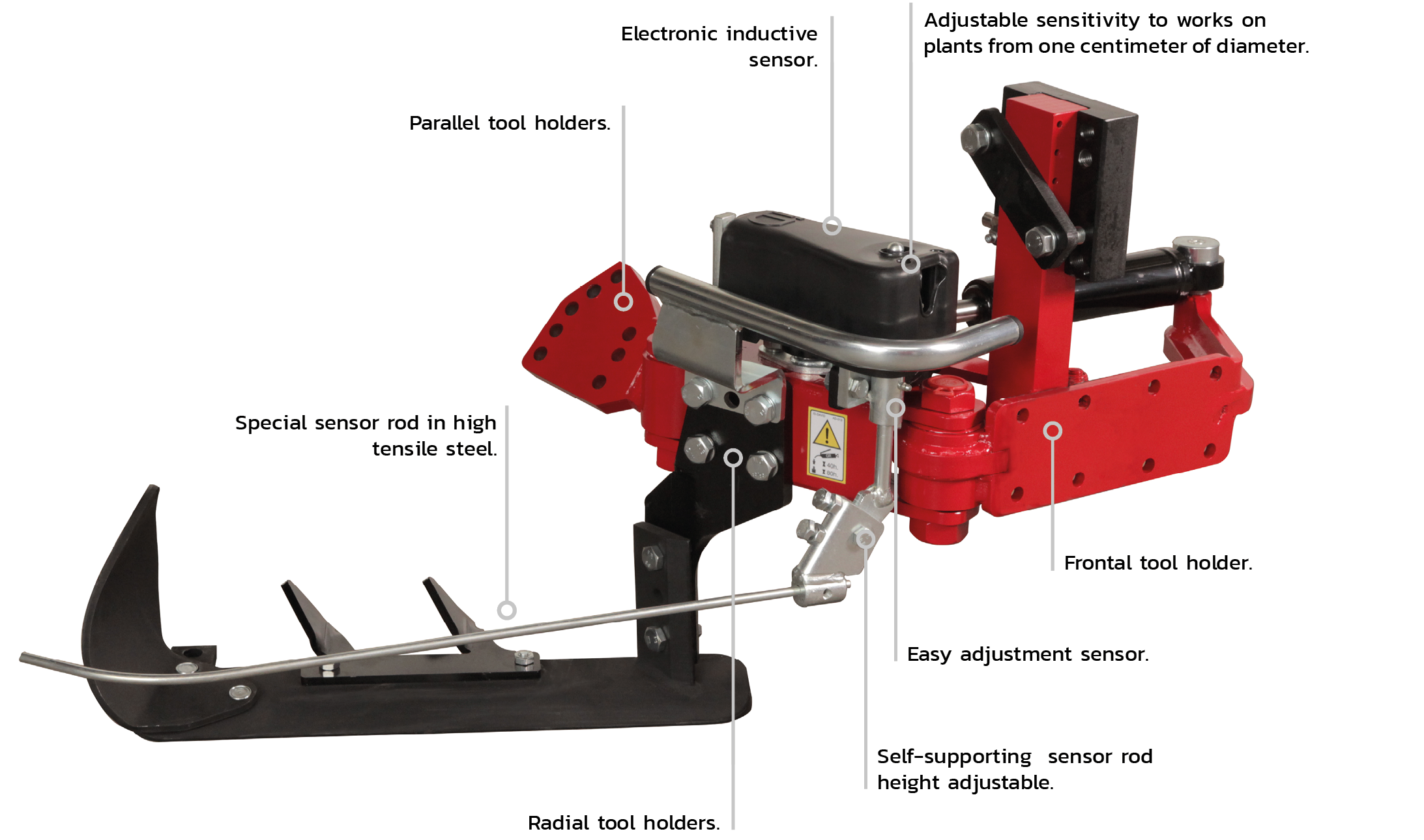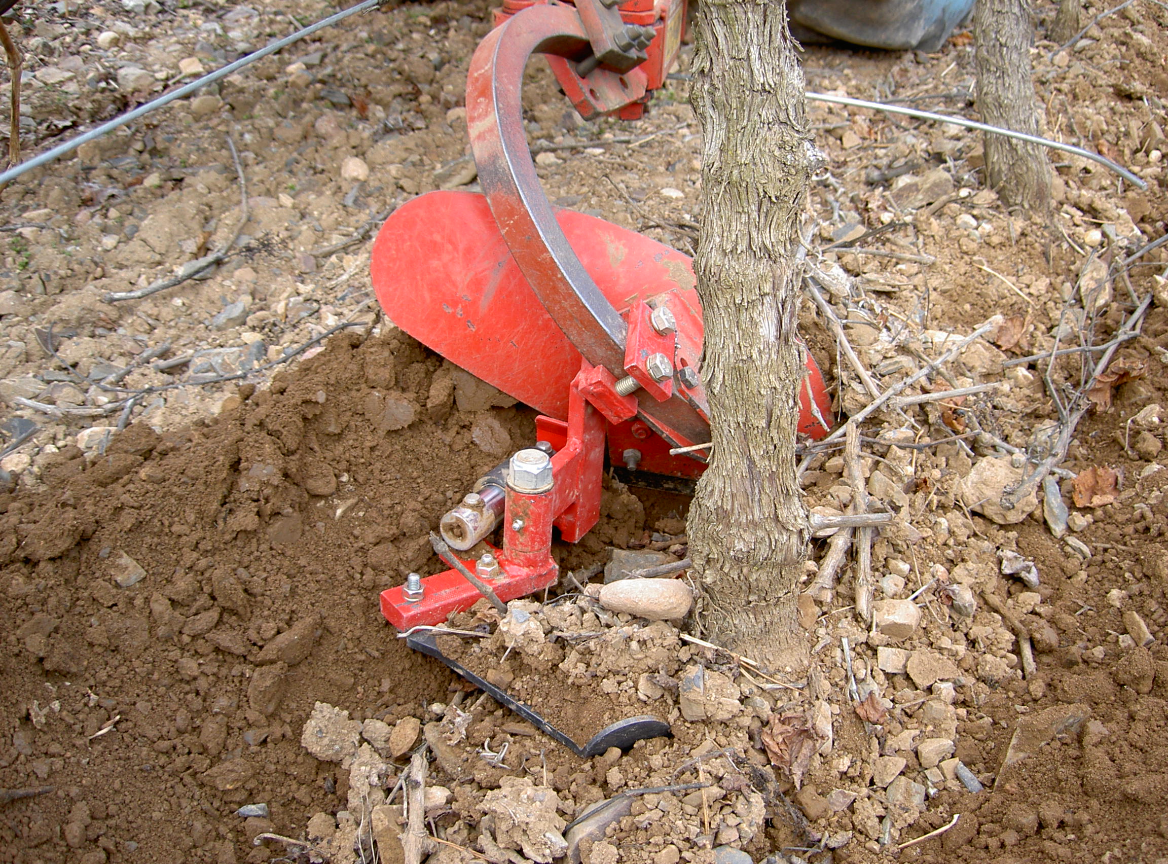 Sıra üzeri mekanik çapalama veya toprak sürme (özellikle üzüm bağları ve meyve ağaçları) için tüm şasilere veya kültivatörlere kolayca monte edilebilen elektrohidrolik sıra üzeri duyargalı çapa aparatı.